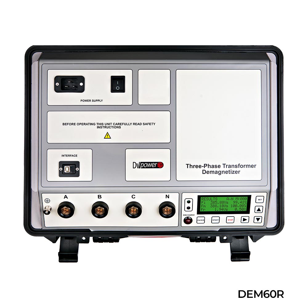 DEM60R är ett helautomatiskt provningsinstrument för trefas avmagnetisering av transformatorer. Avmagnetisering av transformatorns magnetkärna kräver att en växelström appliceras med successivt avtagande amplitud ned till noll. DEM60R genererar denna växelström genom att internt växla polariteten hos en kontrollerad likström. Under avmagnetiseringsprocessen tillför instrumentet ström i stegvis minskande nivåer enligt en egenutvecklad algoritm. Instrumentet kan användas för både enfas- och trefastransformatorer.